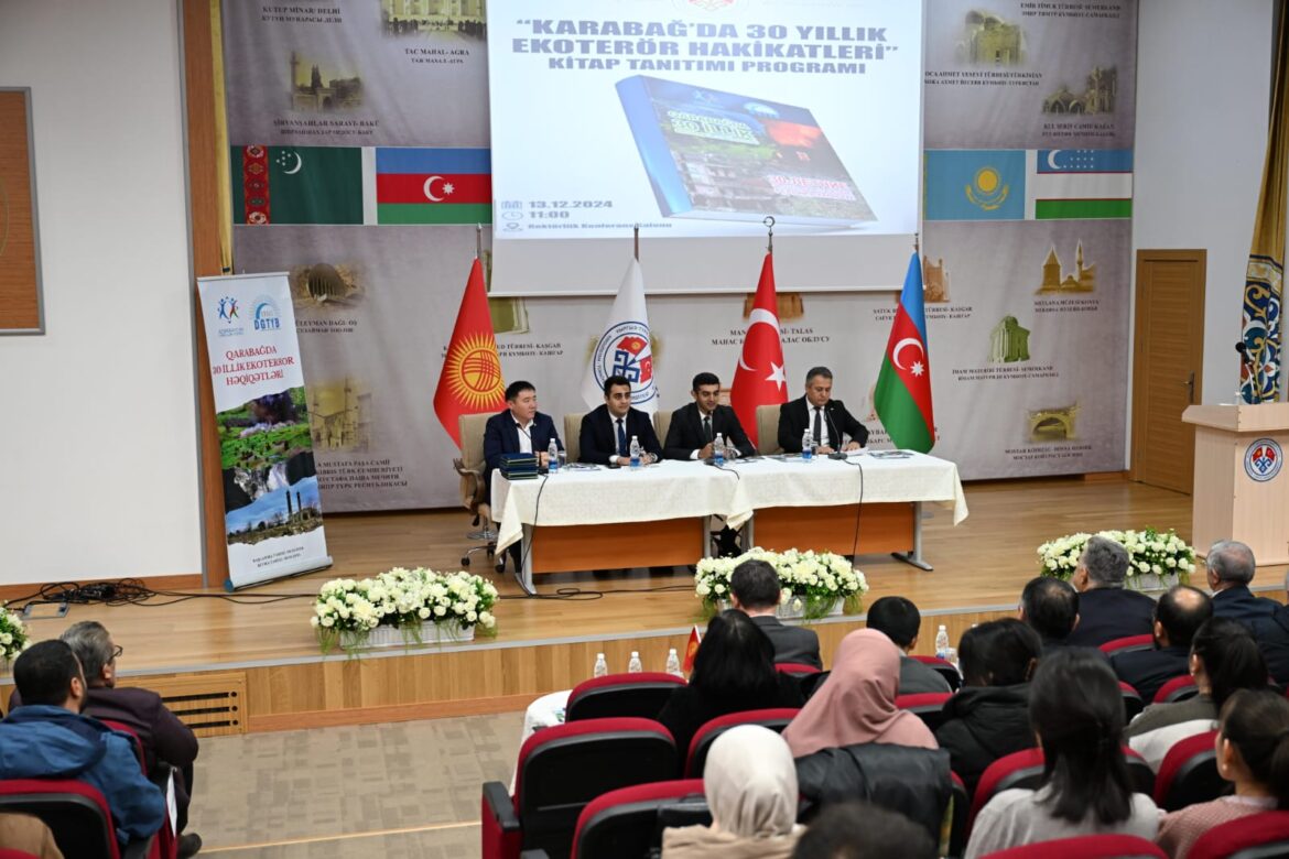“Manas” Qırğızıstan -Türkiyə Universitetinin rektoru Prof. Dr. Mustafa Ceylan, Azərbaycan Respublikasının Qırğız Respublikasındakı Fövqəladə və Səlahiyyətli səfiri Lətif Qəndilov, Azərbaycan Respublikasının Gənclər Fondunun əməkdaşı Seyfur Hacımuradov, Universitetin müəllimi Muhiddin Gümüş, Qırğızıstan Maarif Kamu Vəqfinin müdir yardımçısı Xəyalbek Akmatov, Dünya Gənc Türk Yazarlar Birliyinin başqanı İntiqam Yaşar çıxış edərək mövzu barədə fikirlərini bölüşüblər. Universitet kollektivinə 30 illik müddətdə Qarabağda ermənilərin törətdikləri ekoterror haqqında geniş məlumat verilib. Layihə çərçivəsində çap olunmuş kitablar paylanılıb. Tədbirin sonunda məruzəçilər Dünya Gənc Türk Yazarlar Birliyi tərəfindən təltif olunub. Xatirə fotosu ilə tədbirə yekun vurulub.