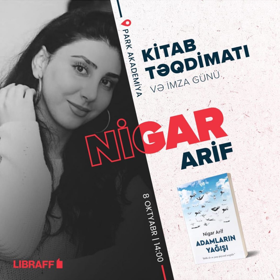 Oktyabrın 8-i saat 14:00-da, Libraffın Elmlər filialında gənc şair Nigar Arifin “Adamların yağışı” kitabının təqdimatı və imza günü keçiriləcək. Kitabda müəllifin müxtəlif mövzularda yazdığı şeirlər toplanmışdır…